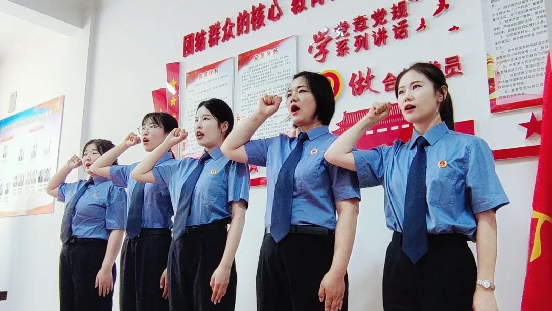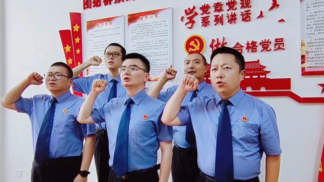 “我志愿加入中国共产党,拥护党的纲领,遵守党的章程……为共产主义奋斗终身,随时准备为党和人民牺牲一切,永不叛党。”党员干警高举右拳,宣誓声铿锵有力,一字一句,神圣而庄重,表达着对党的事业奋斗终身的决心,表达着不忘光辉历程,始终坚定跟党走的信心和决心。